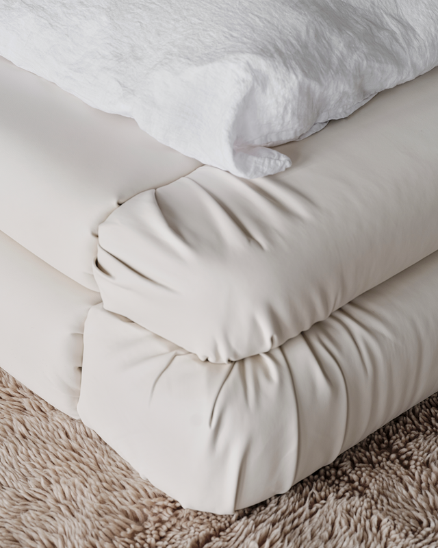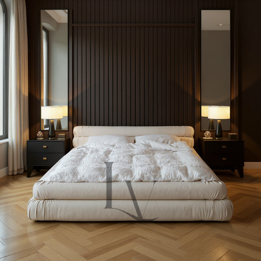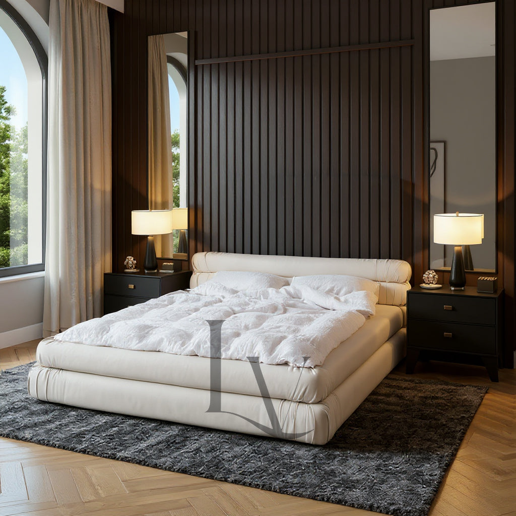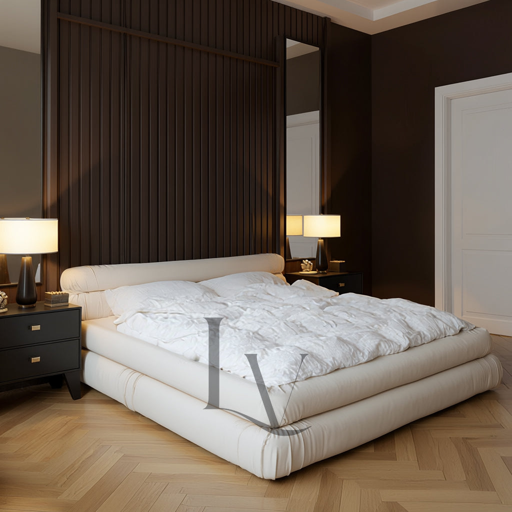 Crafted with plush, generously padded layers, the Aura features a low-profile double-stacked base and a rolled cushioned headboard, creating a soft, inviting aesthetic from every angle. Its seamless upholstery, rounded edges, and handcrafted detailing make it both visually striking and irresistibly comfortable.