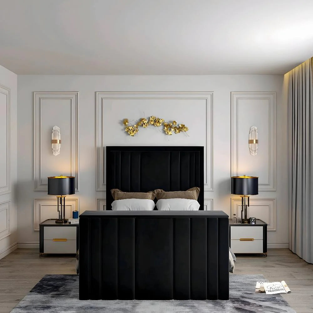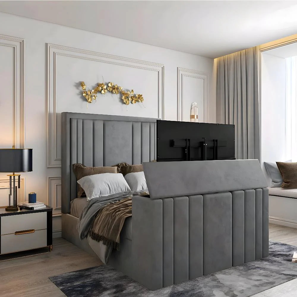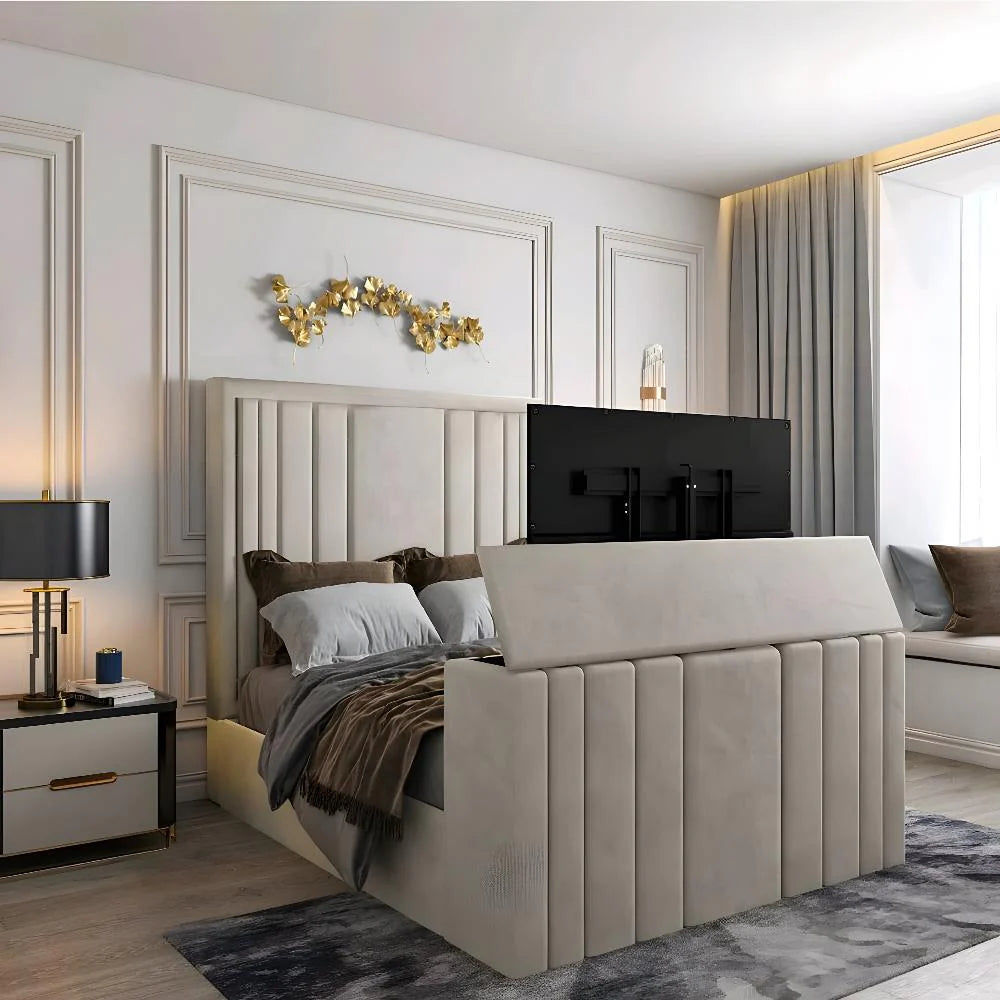 The footboard mirrors this panelled design and discreetly houses a smooth, remote-operated TV lift system. With one touch, your TV rises silently into view for the ultimate cinematic experience—perfect for unwinding at night, catching up on your favourite series, or enjoying relaxed weekend mornings. When not in use, the TV lowers seamlessly, maintaining a beautifully streamlined and clutter-free aesthetic.