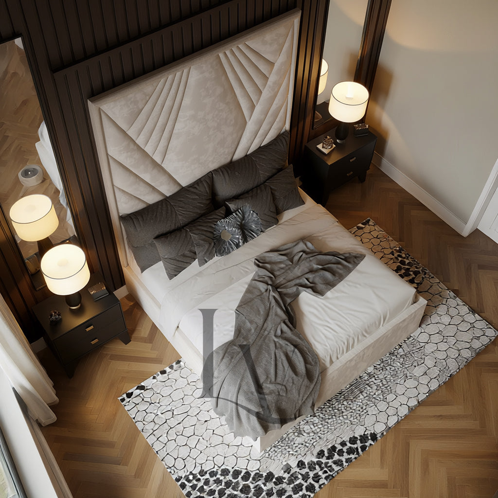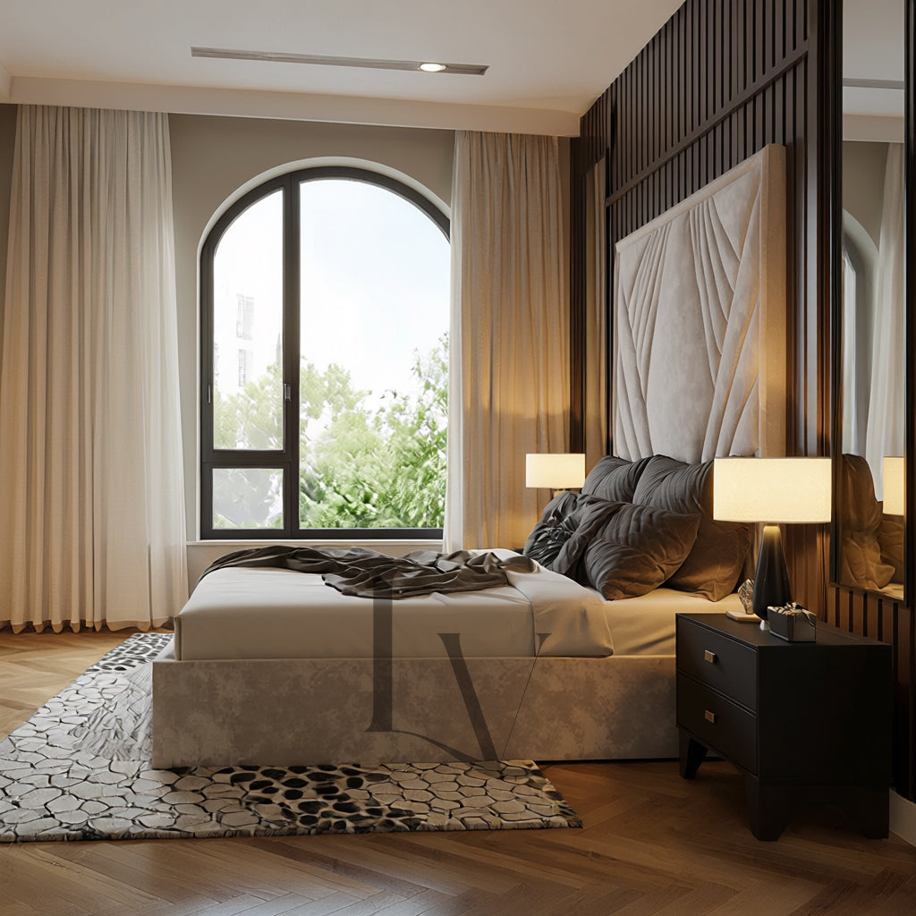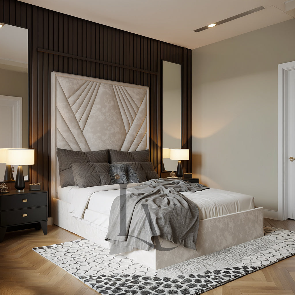 The Verona is a sculptural masterpiece crafted for those who appreciate bold design wrapped in refined elegance. With its striking Art Deco–inspired fan-panel headboard, the Verona instantly becomes the focal point of any luxury bedroom. Each panel is meticulously upholstered to create a dramatic, sunburst effect that adds depth, texture, and architectural beauty to your space.