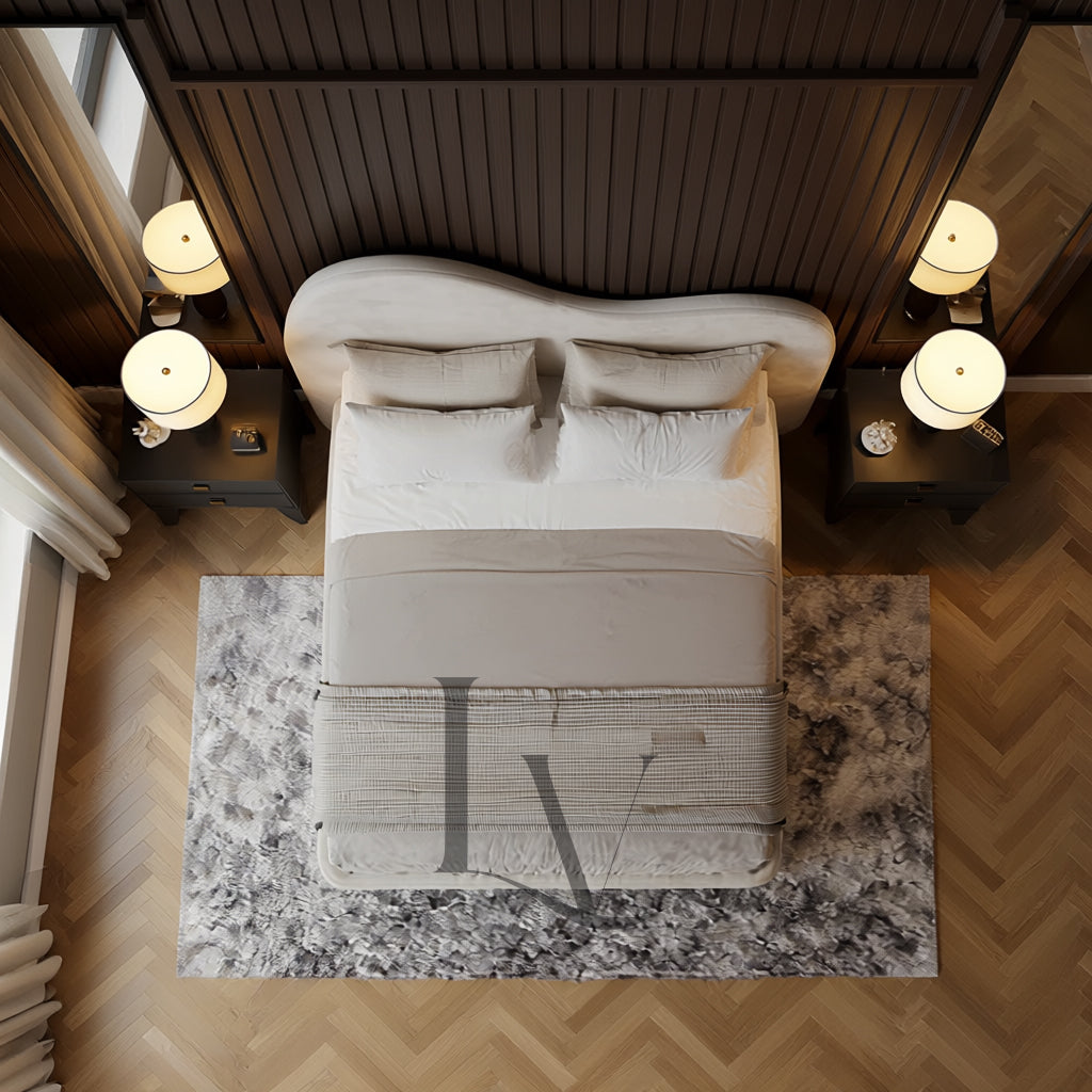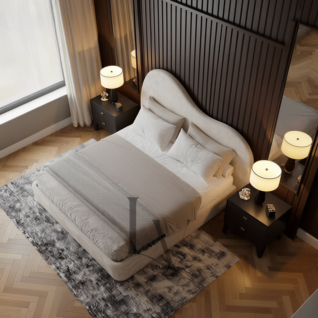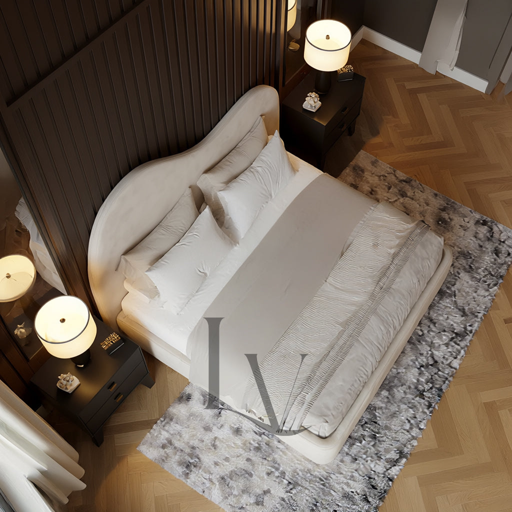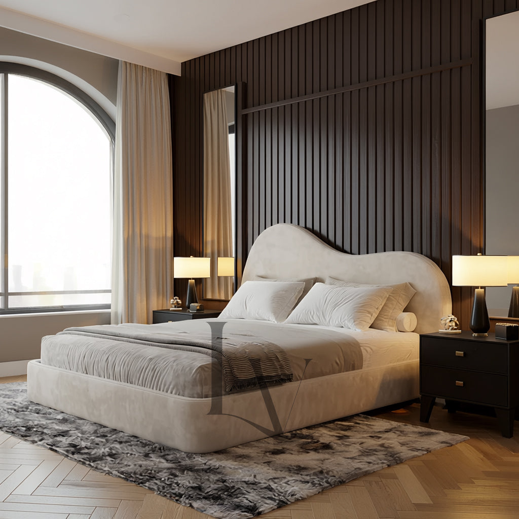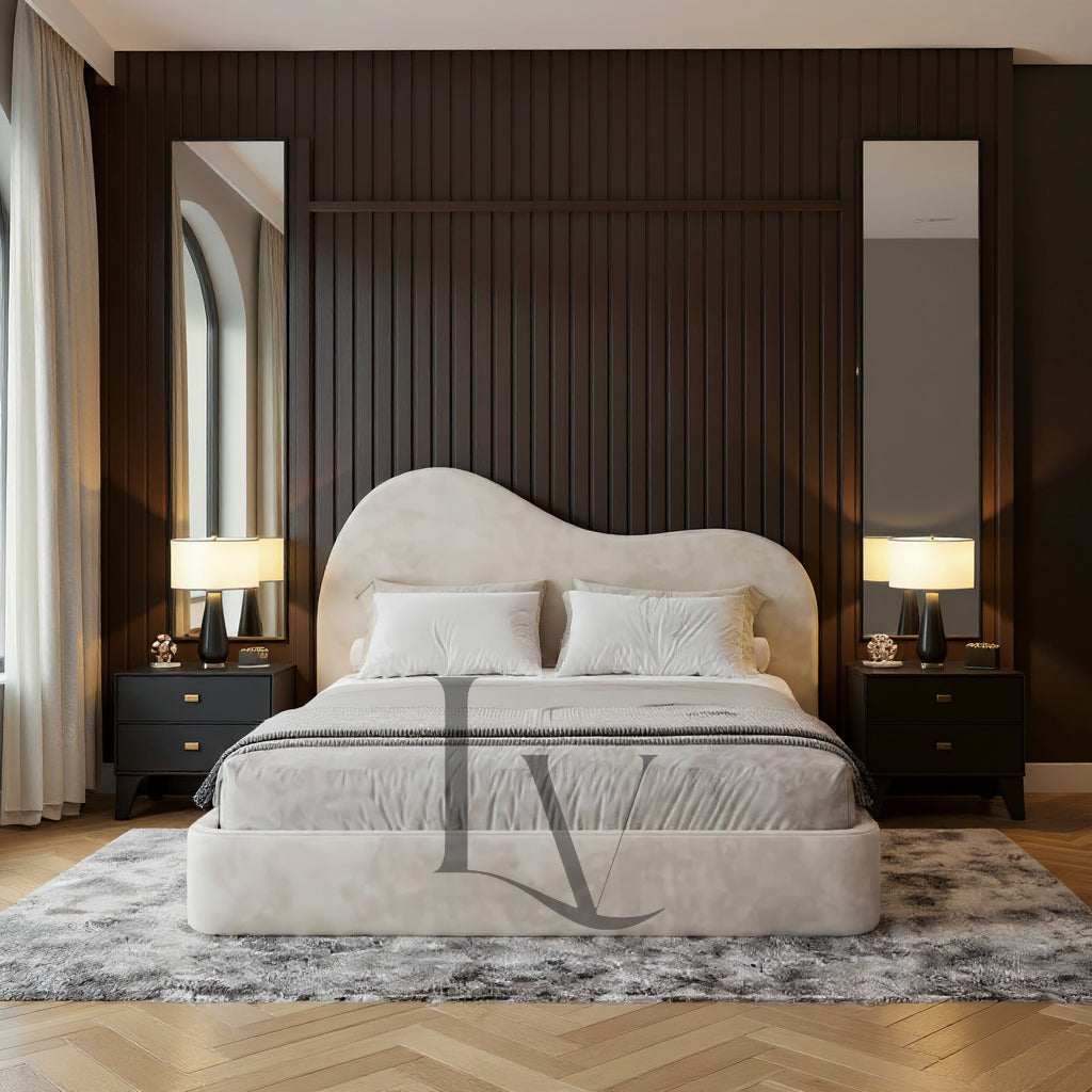 Introduce a touch of artistic elegance to your bedroom with the Liana Bed, a statement piece designed for those who appreciate soft curves, serene forms, and timeless luxury. Its organically sculpted wave headboard creates a calming, cloud-like silhouette that instantly becomes the focal point of any interior.