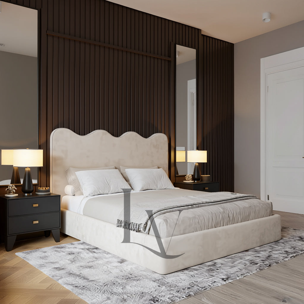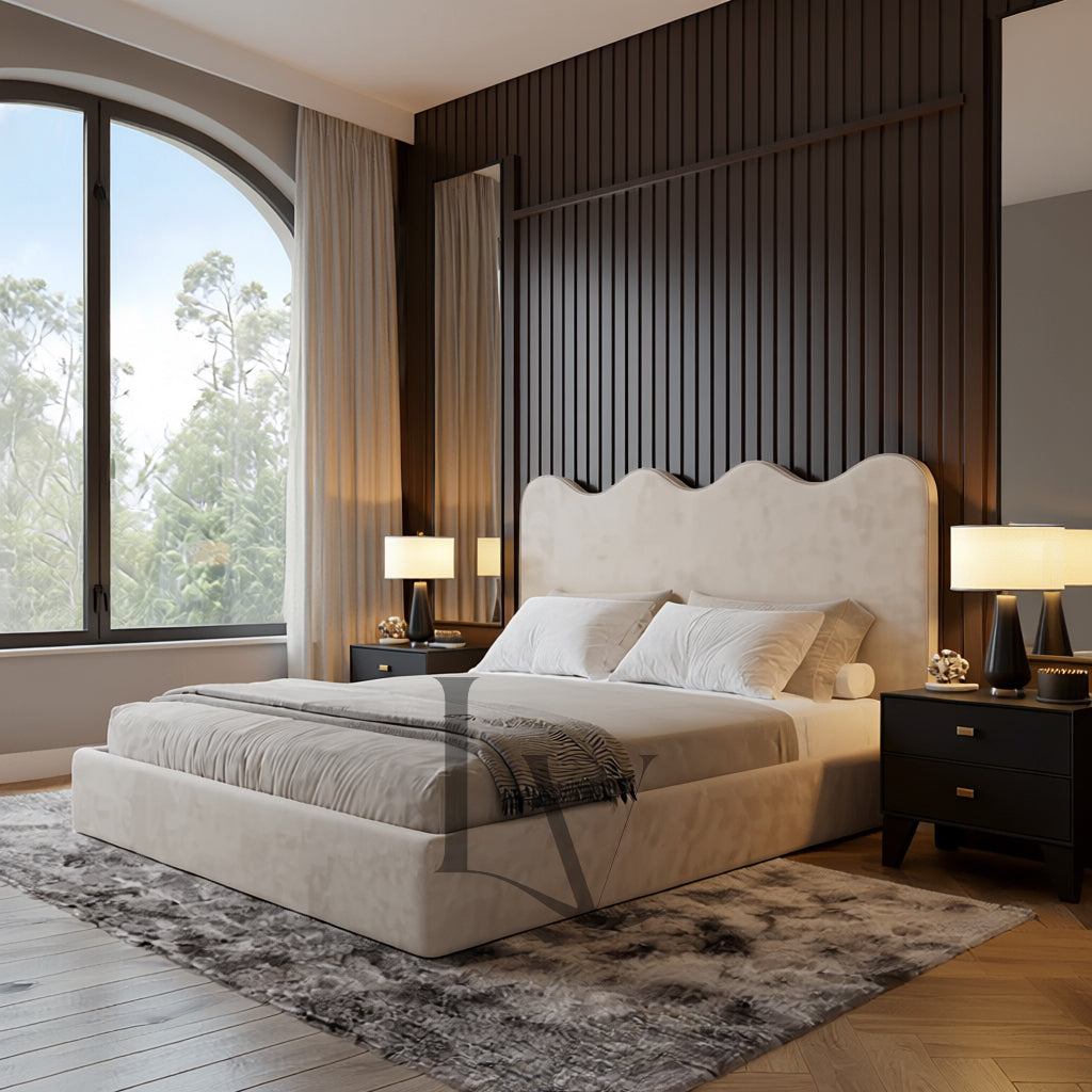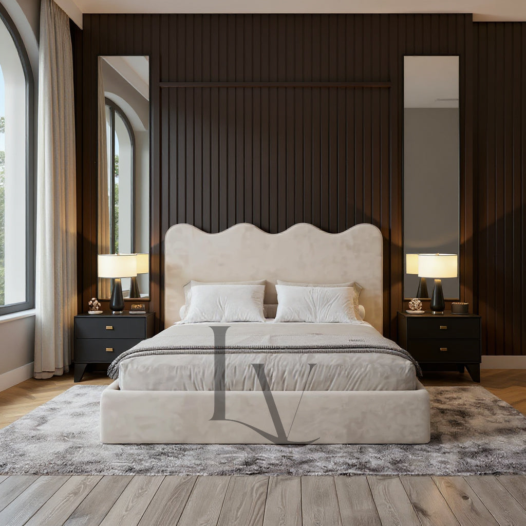 The Elise Bed is a statement of soft luxury, designed for homeowners who appreciate subtle curves, refined detailing and a calming bedroom aesthetic. Its signature wavy scalloped headboard adds a gentle, artistic silhouette that instantly elevates any space, creating a focal point that feels both modern and timeless.