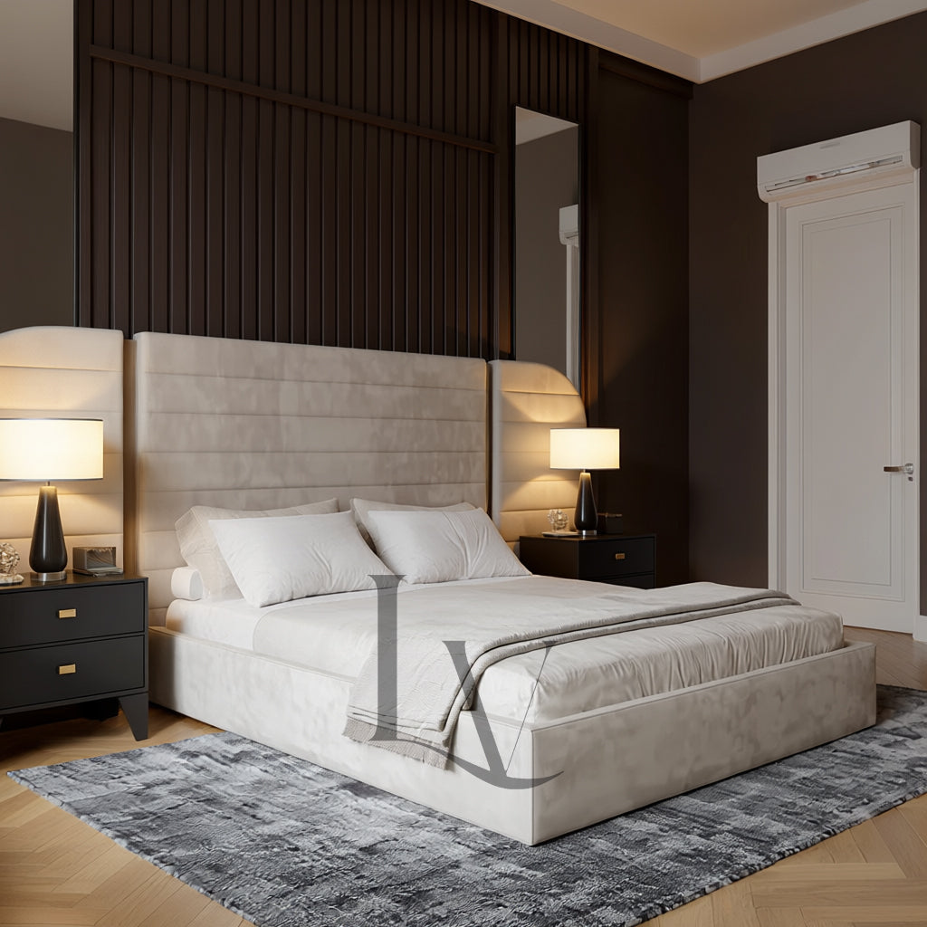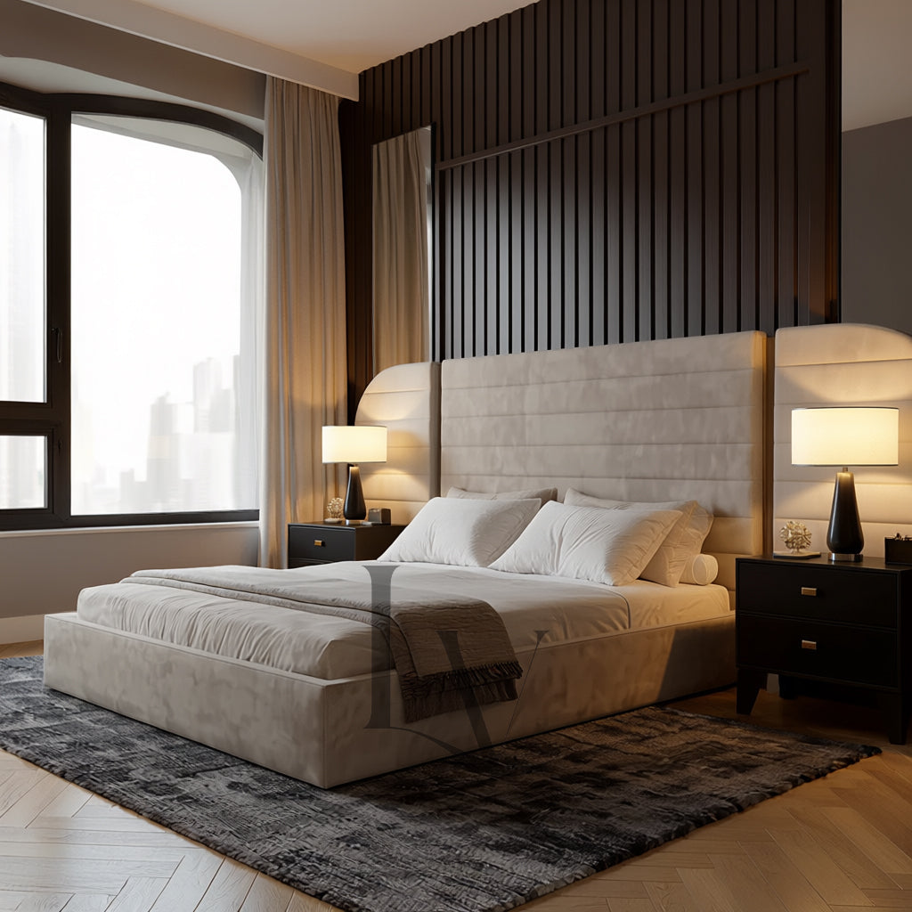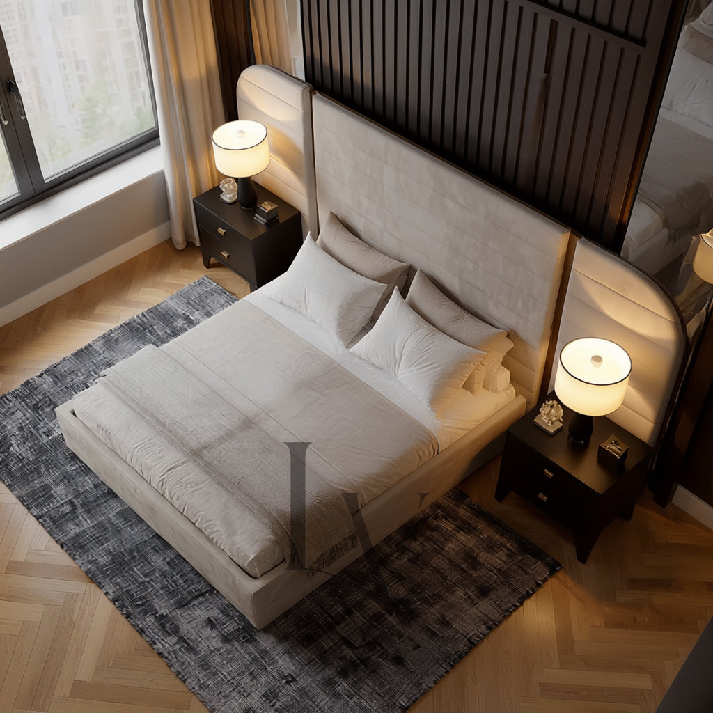 The Opa Bed is a statement of sophistication, architectural elegance, and contemporary comfort—crafted for homes that appreciate bold design executed with subtle refinement. Featuring an ultra-wide headboard with softly curved wing panels, the Opa Bed creates a grand, enveloping backdrop that transforms the entire bedroom into a high-end design suite.