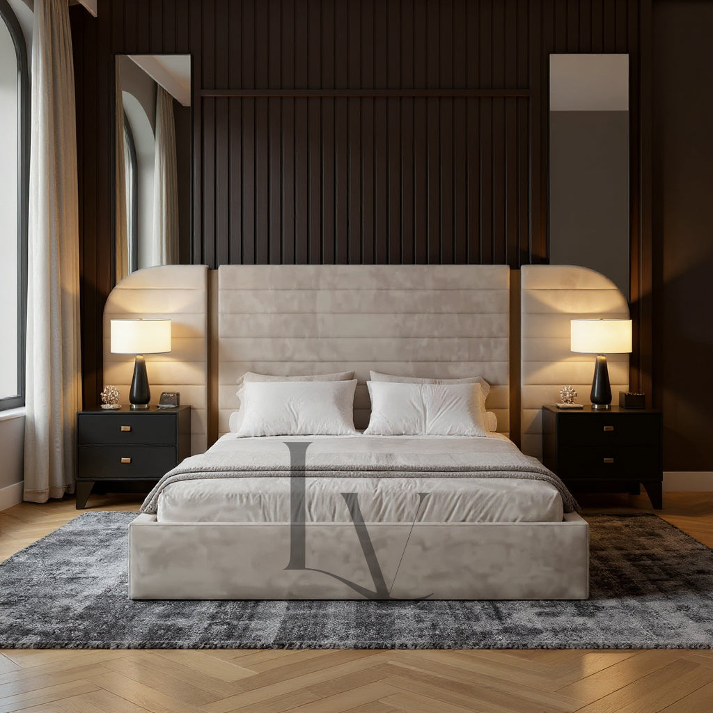 Signature Wide Headboard Design with sculpted wing panels for a commanding, luxurious presence