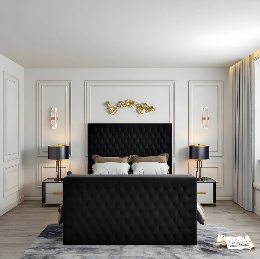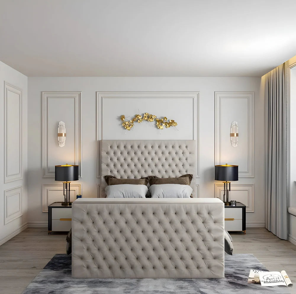 • Deep-buttoned Chesterfield headboard for timeless luxury