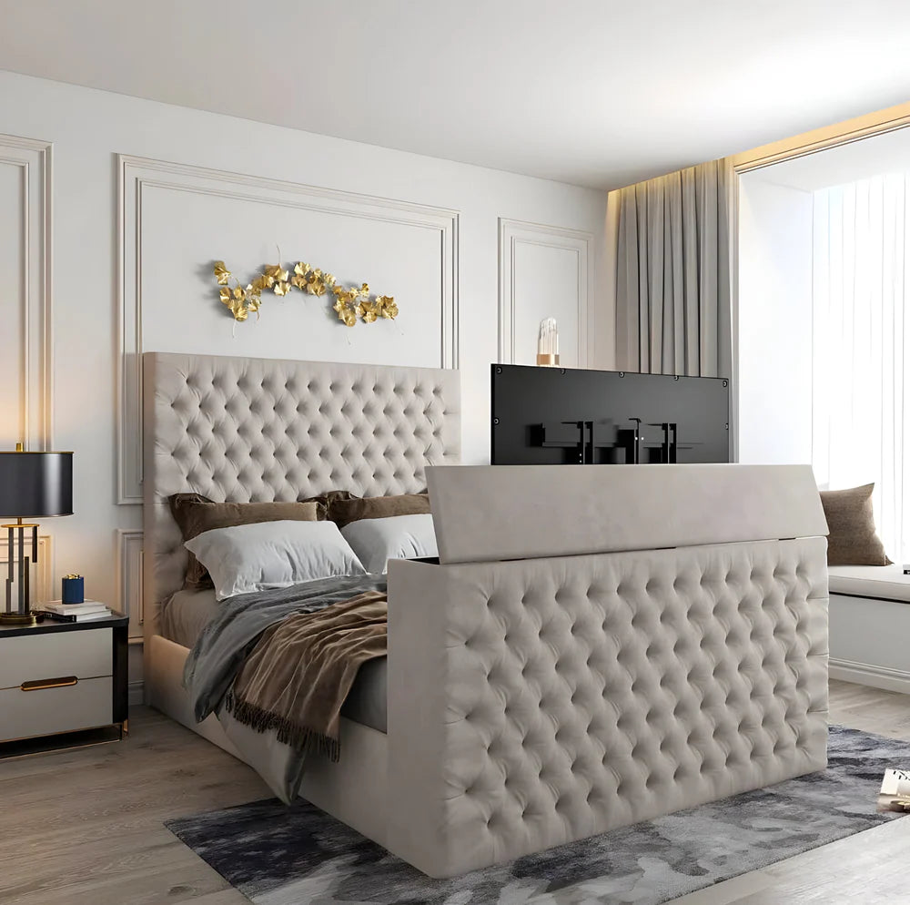 The matching buttoned footboard houses a seamlessly integrated TV lift system. With a smooth, remote-controlled mechanism, your TV rises quietly into view—perfect for cosy evenings, film nights, or relaxed weekend mornings. When you are finished, the TV lowers effortlessly back into the footboard, maintaining a beautifully minimal, clutter-free aesthetic.