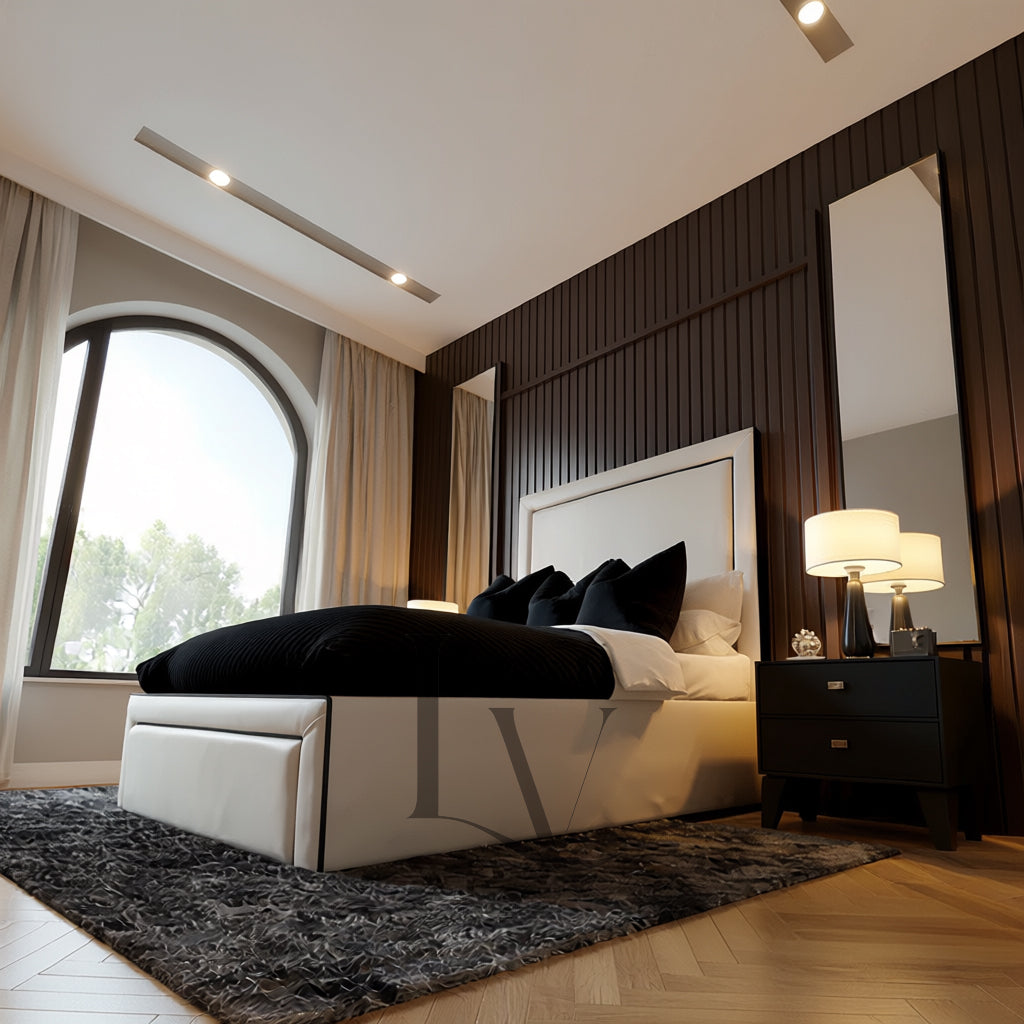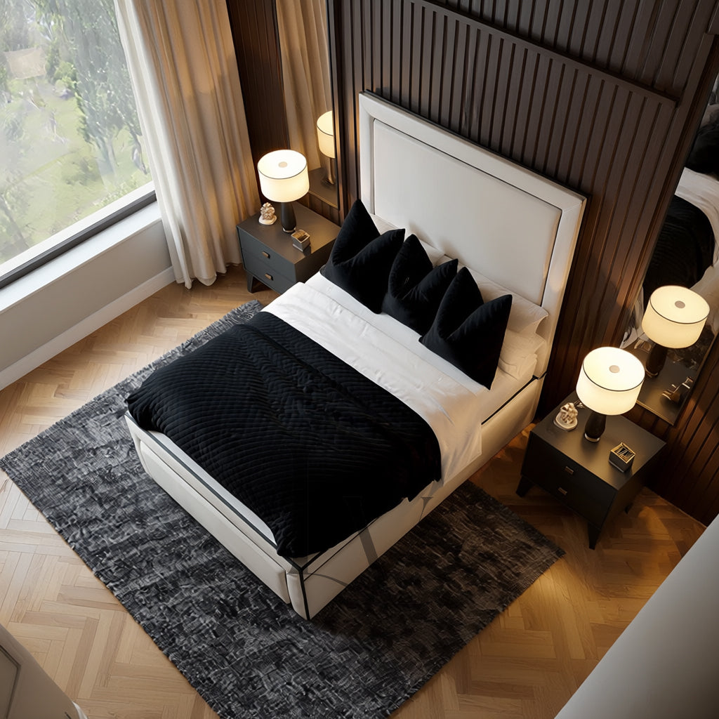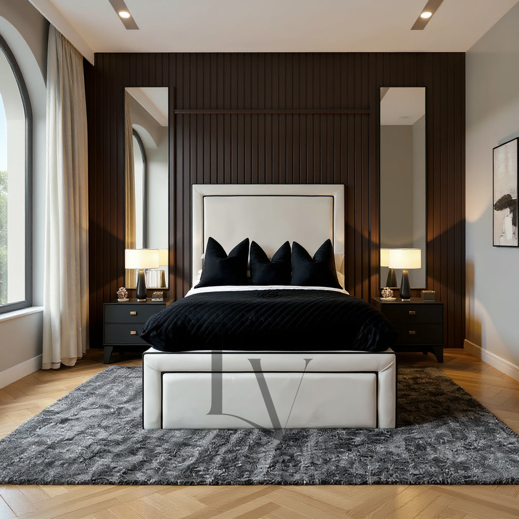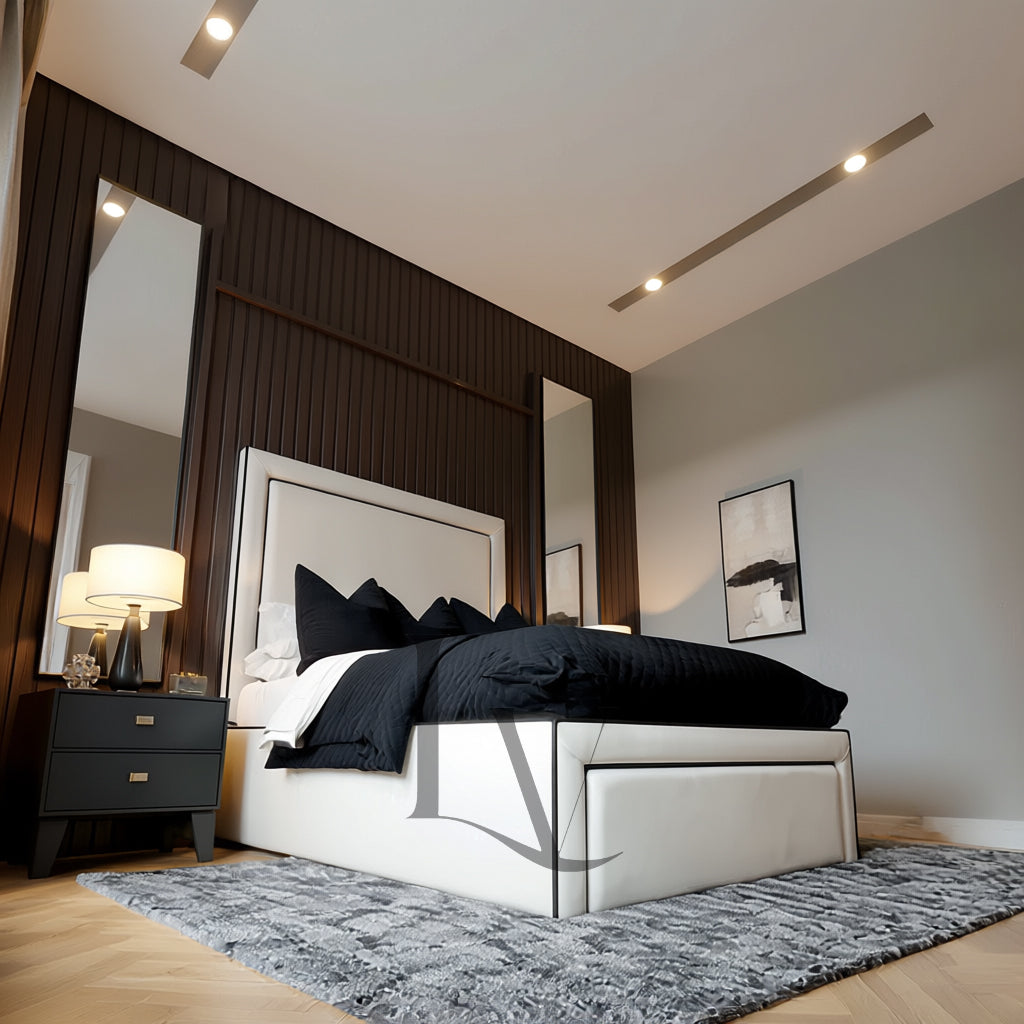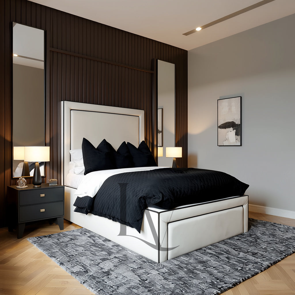 Indulge in contemporary sophistication with The Marbella Bed, a statement piece designed for homes that value refined minimalism and flawless craftsmanship. Featuring dual piping detailing across the headboard, footboard, and side rails, this bed blends clean architectural lines with luxury upholstery to create a timeless, elegant centerpiece.